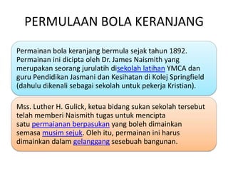 10 SEJARAH BOLA KERANJANG Sukan bola keranjang mula diperkenalkan oleh Dr James Naismith pada tahun 1891Ketika itu beliau adalah seorang pemimpin YMCA Springfield Massachussets Amerika Syarikat. PPT TEKNIK DASAR SHOOTING BOLA BASKET Rini Ayu Agustin. Sejarah bola keranjang Nadwah Khalid.